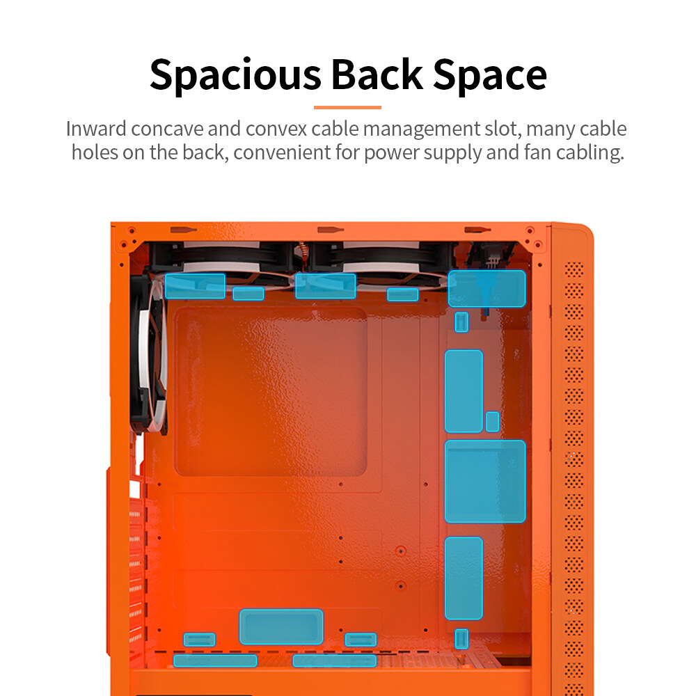 Spacious back space and inward concave and convex cable management slot, many cable holes on the back, convenient for power supply and fan cabling.